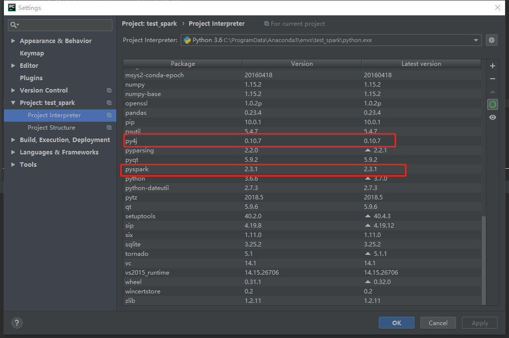 接着我们到项目设置中的project interpreter中添加py4j和pyspark包。