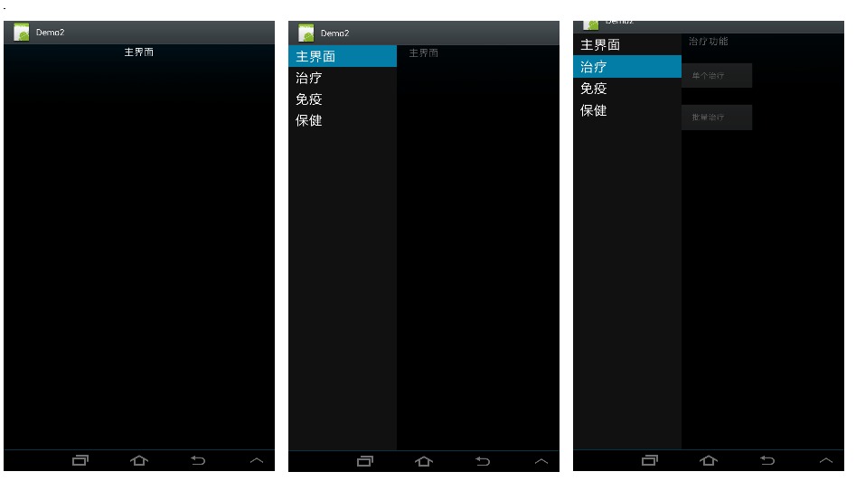 }这段代码比较关键的就是,从Main页面中获取到了用于显示区域的_drawer,和用于导航区域显示的_drawerList,设置导航区域显示的内容为titiles数组,默认进入页面显示MainFragment中的内容,通过定义drawerList的ItemClick事件,从而达到点击不用的项显示不同的页面的功能。 下面是程序运行的截图: